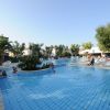 Piscina ampia con bambini, palme, e sdraio bianche.