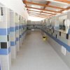 Corridoio di bagni pubblici con piastrelle a motivi blu e grigi e soffitto con travi in legno.