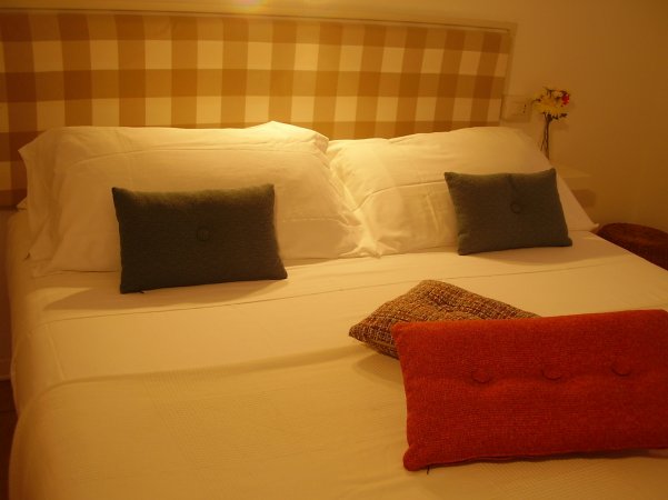Letto matrimoniale con cuscini blu e rossi, testata a quadri beige.