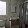 Bagno compatto con doccia, WC, lavandino con mobile in legno e specchio.