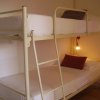 Letto a castello bianco con cuscini, illuminato da una lampada appesa.