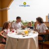Famiglia di quattro persone che fa colazione su un terrazzo soleggiato.