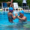 Uomo e bambino con cuffie da nuoto azzurre giocano in piscina.