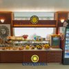Reception di un hotel con bancone e buffet dolci.
