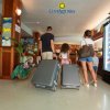 Una famiglia con valigie entra in un hotel, vicino a un frigorifero con bevande.