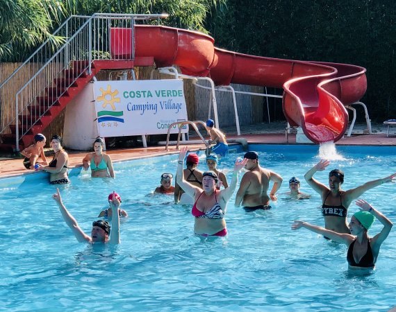 Persone in una piscina vicino a uno scivolo rosso, un cartello delinea il nome del villaggio.