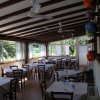 Interno di un ristorante con tavoli apparecchiati e vetrate luminose.