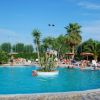 Piscina affollata circondata da lettini, ombrelloni e palme. Cielo sereno.