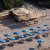 Spiaggia soleggiata con file di ombrelloni gialli e arancioni, mare calmo.