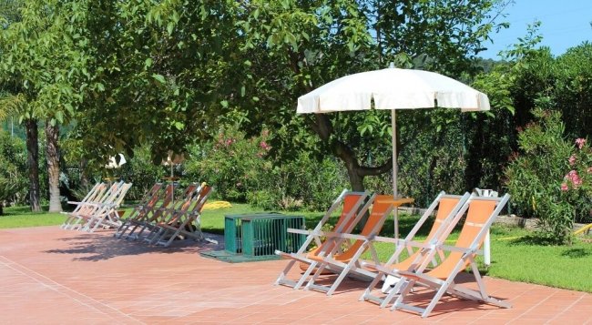 Sdraio arancioni con ombrellone, circondate da alberi.