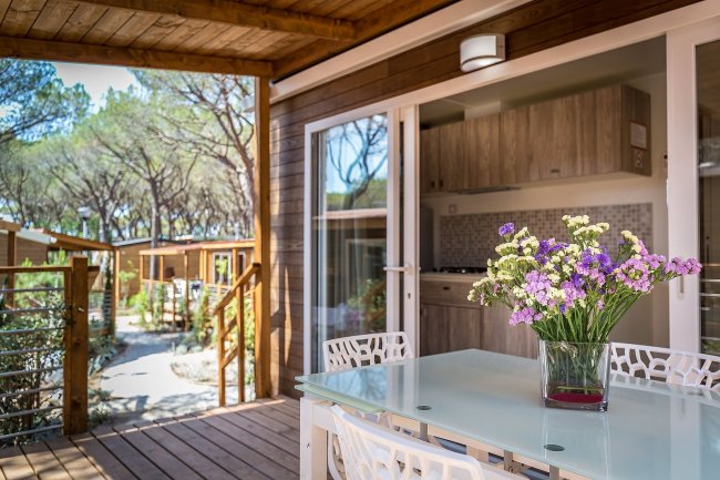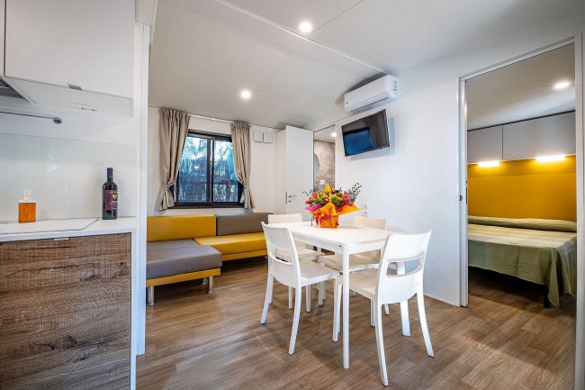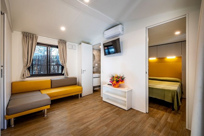 camera matrimoniale, una camera con letto a castello e una verandina privata con angolo cottunra esterno. La tenda è inoltre dotata di Aria Condizionata (Caldo e Freddo).